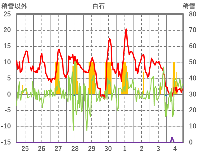 | 日 | 時 | 気温 | 降水 | 風向/風速 | 日照 | 積雪 | 降雪 |