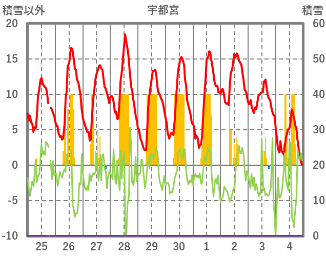 | 日 | 時 | 気温 | 降水 | 風向/風速 | 日照 | 積雪 | 降雪 |