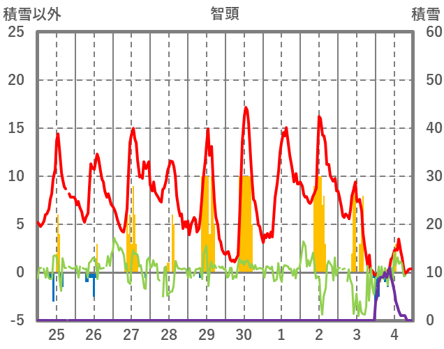 | 日 | 時 | 気温 | 降水 | 風向/風速 | 日照 | 積雪 | 降雪 |