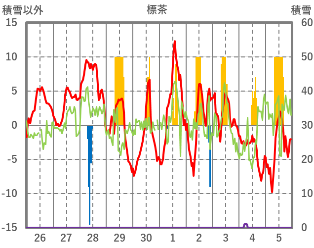| 日 | 時 | 気温 | 降水 | 風向/風速 | 日照 | 積雪 | 降雪 |