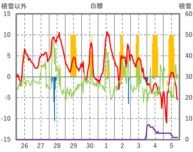 | 日 | 時 | 気温 | 降水 | 風向/風速 | 日照 | 積雪 | 降雪 |