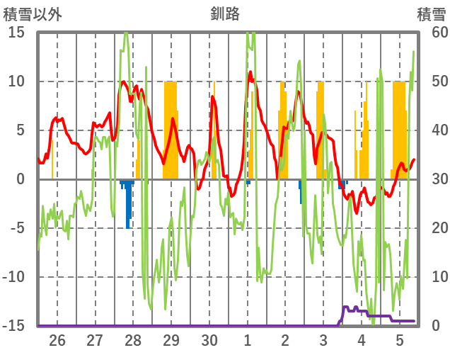 | 日 | 時 | 気温 | 降水 | 風向/風速 | 日照 | 積雪 | 降雪 |