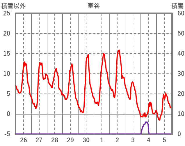 | 日 | 時 | 気温 | 降水 | 風向/風速 | 日照 | 積雪 | 降雪 |