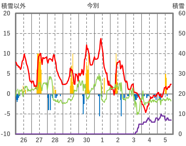 | 日 | 時 | 気温 | 降水 | 風向/風速 | 日照 | 積雪 | 降雪 |