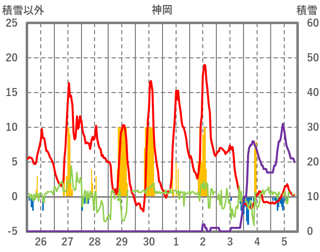 | 日 | 時 | 気温 | 降水 | 風向/風速 | 日照 | 積雪 | 降雪 |