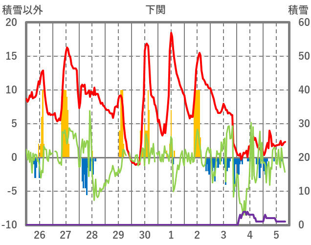 | 日 | 時 | 気温 | 降水 | 風向/風速 | 日照 | 積雪 | 降雪 |