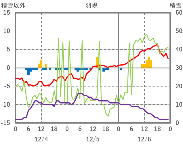 | 日 | 時 | 気温 | 降水 | 風向/風速 | 日照 | 積雪 | 降雪 |