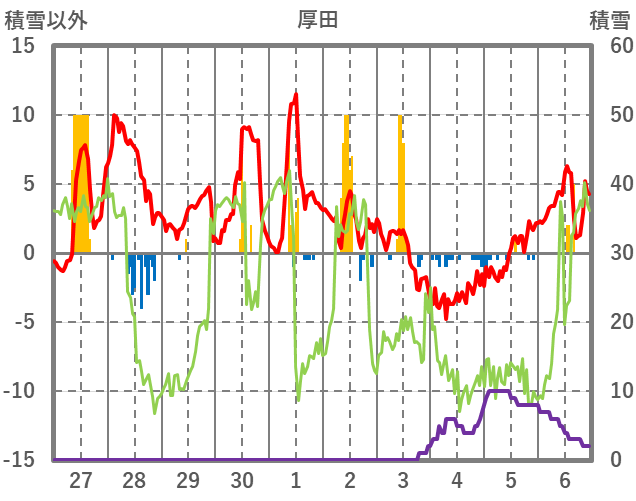 | 日 | 時 | 気温 | 降水 | 風向/風速 | 日照 | 積雪 | 降雪 |
