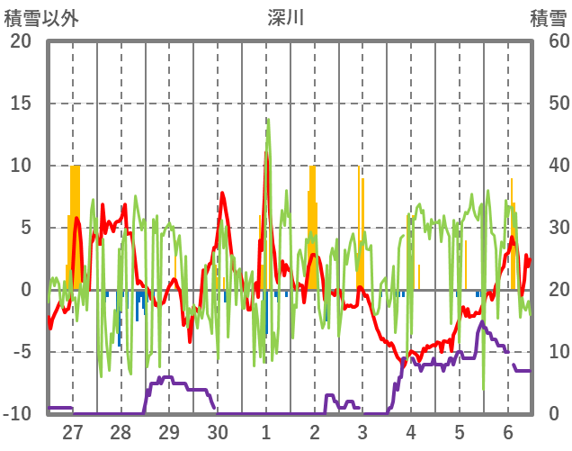 | 日 | 時 | 気温 | 降水 | 風向/風速 | 日照 | 積雪 | 降雪 |