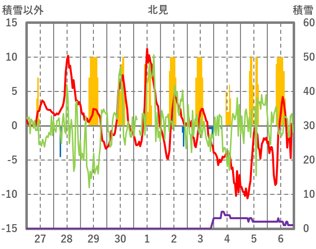 | 日 | 時 | 気温 | 降水 | 風向/風速 | 日照 | 積雪 | 降雪 |