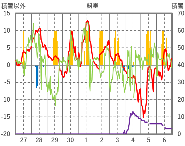 | 日 | 時 | 気温 | 降水 | 風向/風速 | 日照 | 積雪 | 降雪 |