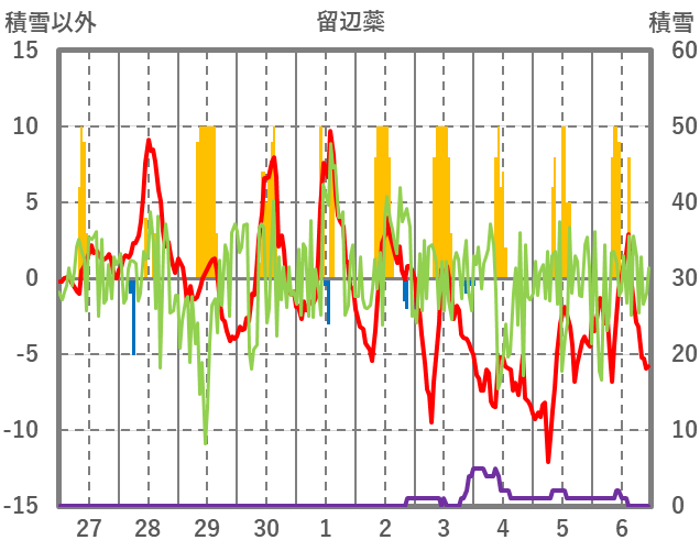 | 日 | 時 | 気温 | 降水 | 風向/風速 | 日照 | 積雪 | 降雪 |