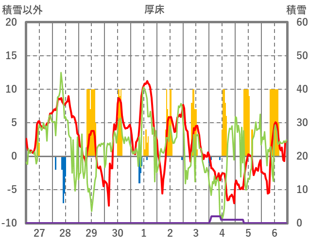 | 日 | 時 | 気温 | 降水 | 風向/風速 | 日照 | 積雪 | 降雪 |
