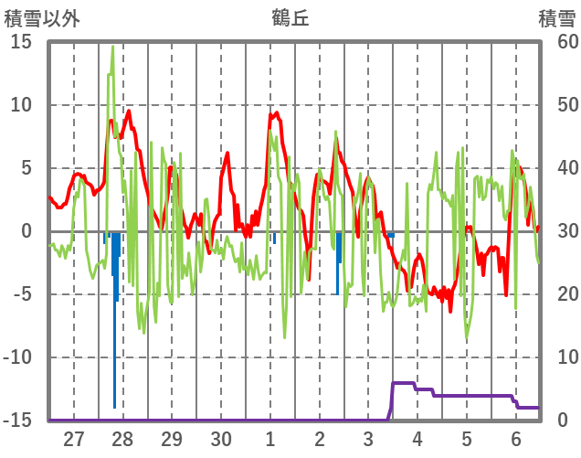 | 日 | 時 | 気温 | 降水 | 風向/風速 | 日照 | 積雪 | 降雪 |