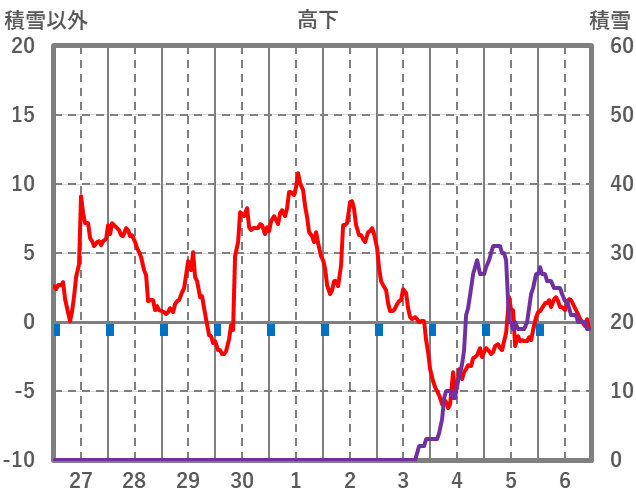| 日 | 時 | 気温 | 降水 | 風向/風速 | 日照 | 積雪 | 降雪 |