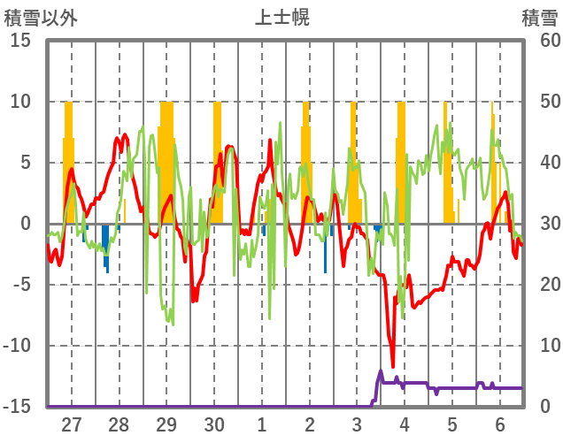| 日 | 時 | 気温 | 降水 | 風向/風速 | 日照 | 積雪 | 降雪 |