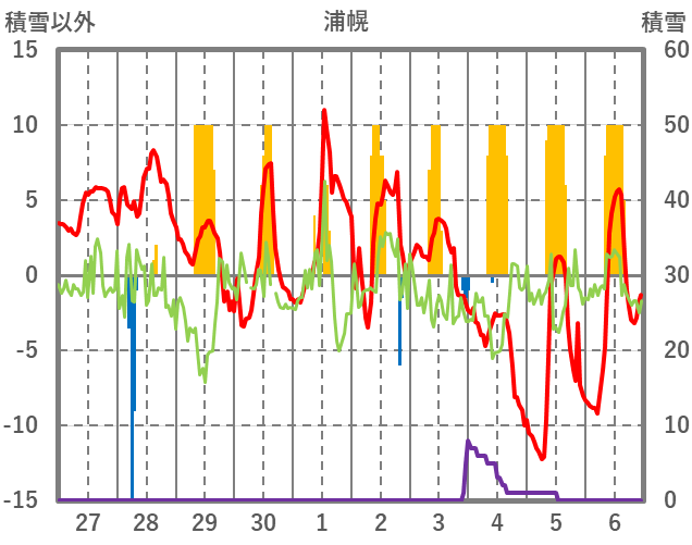 | 日 | 時 | 気温 | 降水 | 風向/風速 | 日照 | 積雪 | 降雪 |