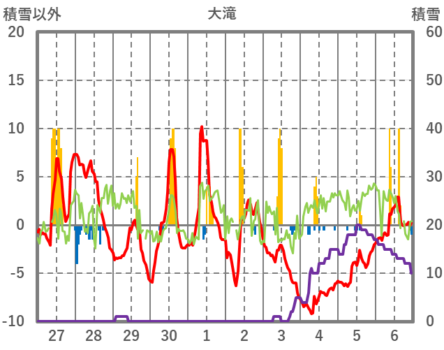 | 日 | 時 | 気温 | 降水 | 風向/風速 | 日照 | 積雪 | 降雪 |