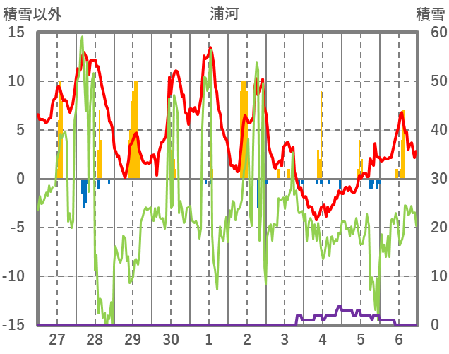 | 日 | 時 | 気温 | 降水 | 風向/風速 | 日照 | 積雪 | 降雪 |