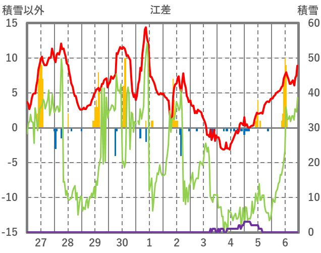| 日 | 時 | 気温 | 降水 | 風向/風速 | 日照 | 積雪 | 降雪 |