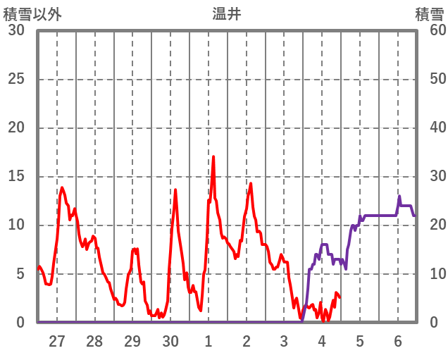 | 日 | 時 | 気温 | 降水 | 風向/風速 | 日照 | 積雪 | 降雪 |