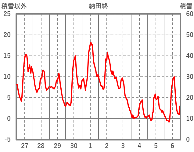 | 日 | 時 | 気温 | 降水 | 風向/風速 | 日照 | 積雪 | 降雪 |