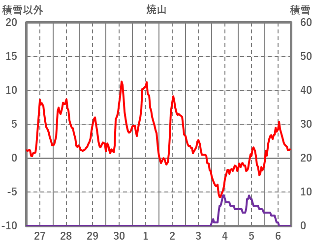 | 日 | 時 | 気温 | 降水 | 風向/風速 | 日照 | 積雪 | 降雪 |