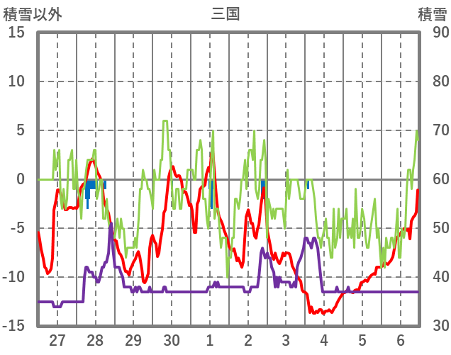| 日 | 時 | 気温 | 降水 | 風向/風速 | 日照 | 積雪 | 降雪 |