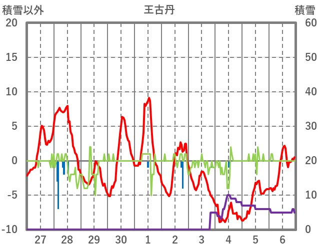 | 日 | 時 | 気温 | 降水 | 風向/風速 | 日照 | 積雪 | 降雪 |