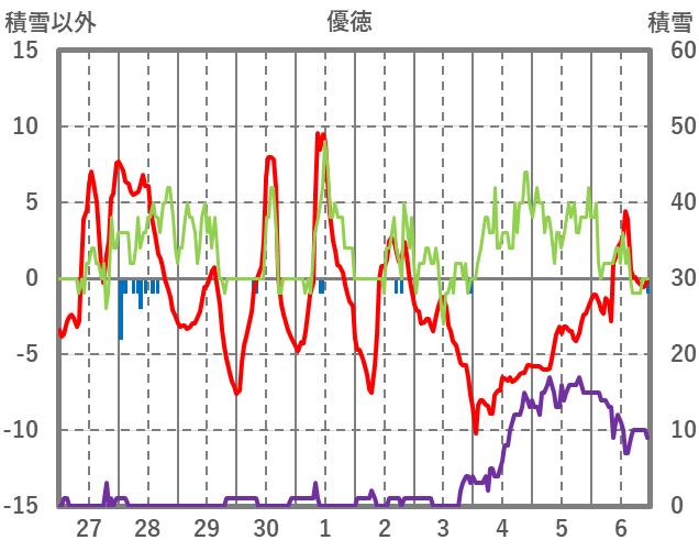 | 日 | 時 | 気温 | 降水 | 風向/風速 | 日照 | 積雪 | 降雪 |