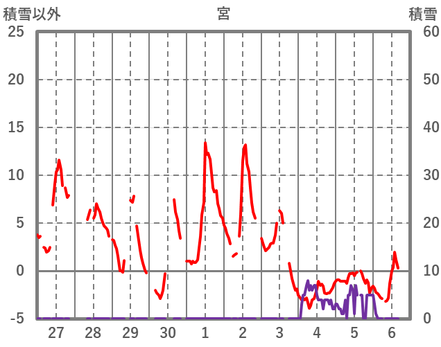 | 日 | 時 | 気温 | 降水 | 風向/風速 | 日照 | 積雪 | 降雪 |