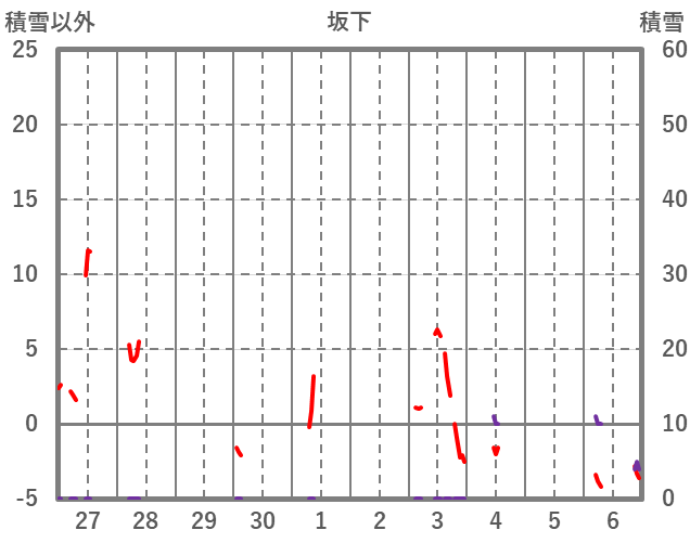 | 日 | 時 | 気温 | 降水 | 風向/風速 | 日照 | 積雪 | 降雪 |