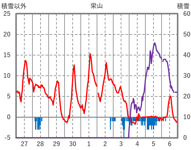 | 日 | 時 | 気温 | 降水 | 風向/風速 | 日照 | 積雪 | 降雪 |