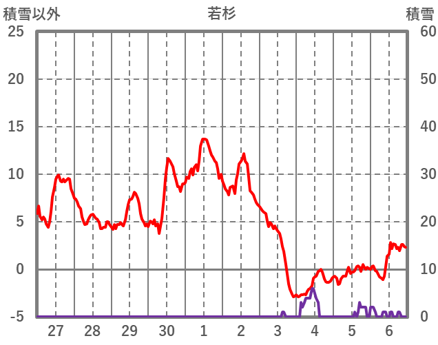 | 日 | 時 | 気温 | 降水 | 風向/風速 | 日照 | 積雪 | 降雪 |