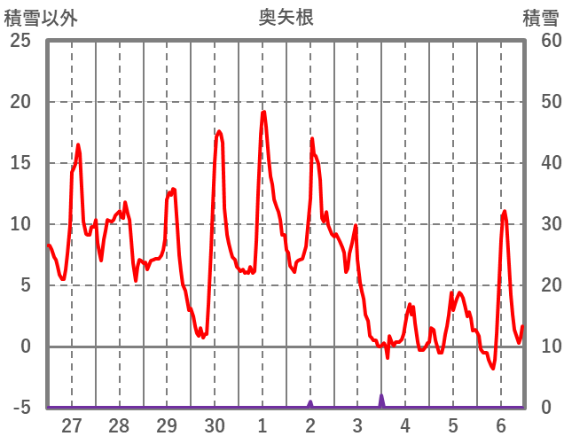 | 日 | 時 | 気温 | 降水 | 風向/風速 | 日照 | 積雪 | 降雪 |