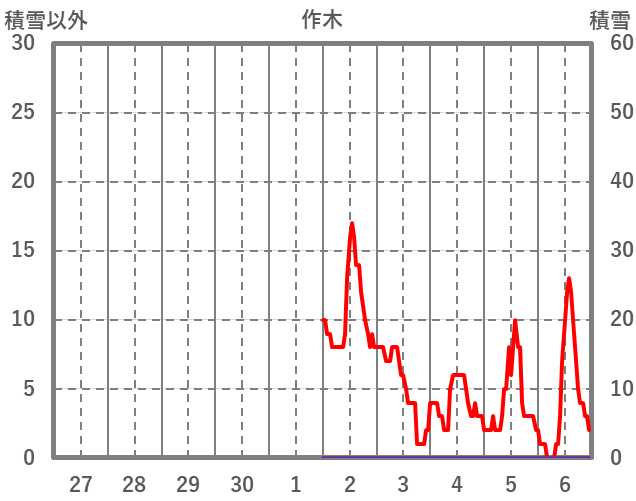 | 日 | 時 | 気温 | 降水 | 風向/風速 | 日照 | 積雪 | 降雪 |