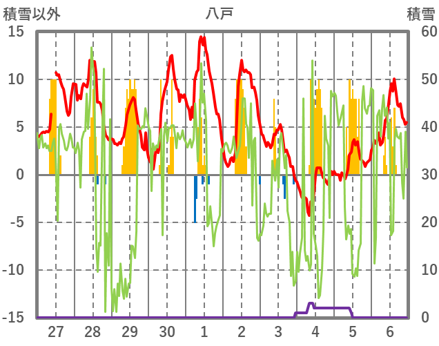 | 日 | 時 | 気温 | 降水 | 風向/風速 | 日照 | 積雪 | 降雪 |