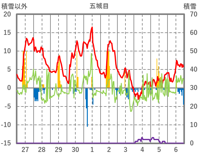 | 日 | 時 | 気温 | 降水 | 風向/風速 | 日照 | 積雪 | 降雪 |