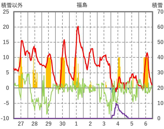 | 日 | 時 | 気温 | 降水 | 風向/風速 | 日照 | 積雪 | 降雪 |