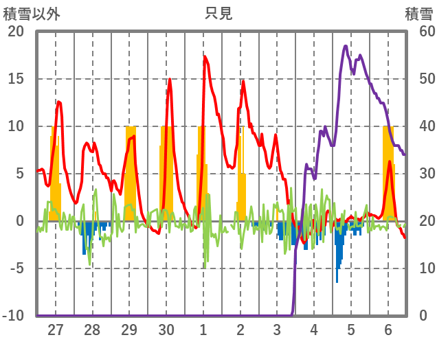 | 日 | 時 | 気温 | 降水 | 風向/風速 | 日照 | 積雪 | 降雪 |