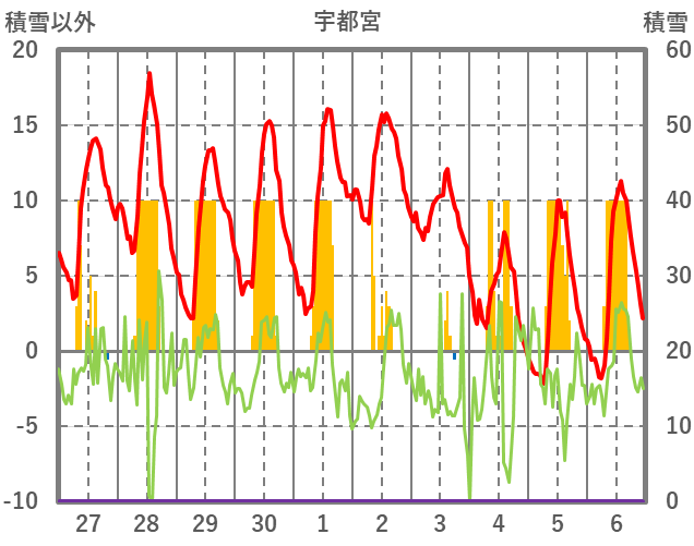 | 日 | 時 | 気温 | 降水 | 風向/風速 | 日照 | 積雪 | 降雪 |
