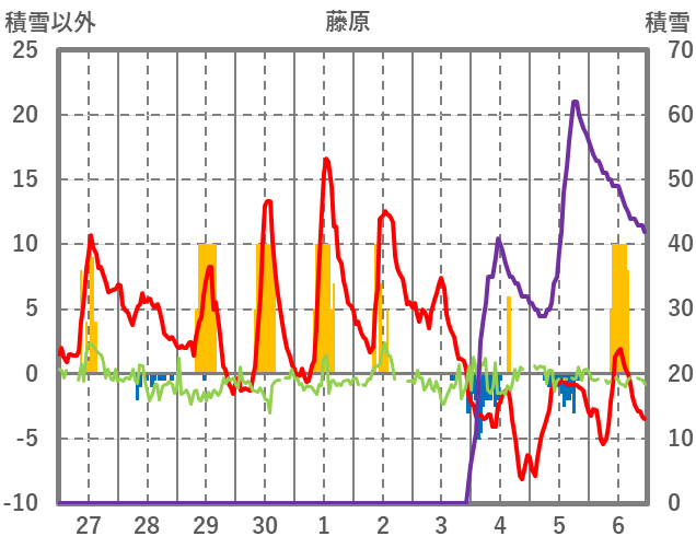 | 日 | 時 | 気温 | 降水 | 風向/風速 | 日照 | 積雪 | 降雪 |