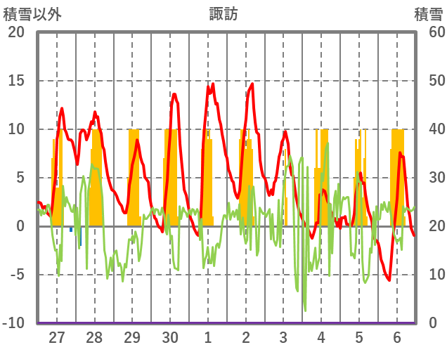 | 日 | 時 | 気温 | 降水 | 風向/風速 | 日照 | 積雪 | 降雪 |