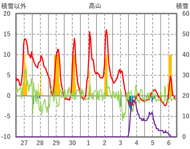 | 日 | 時 | 気温 | 降水 | 風向/風速 | 日照 | 積雪 | 降雪 |