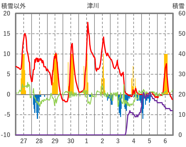 | 日 | 時 | 気温 | 降水 | 風向/風速 | 日照 | 積雪 | 降雪 |