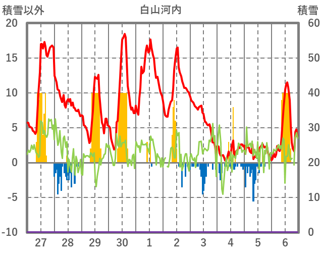 | 日 | 時 | 気温 | 降水 | 風向/風速 | 日照 | 積雪 | 降雪 |