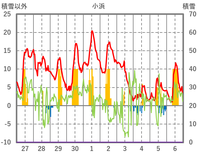| 日 | 時 | 気温 | 降水 | 風向/風速 | 日照 | 積雪 | 降雪 |