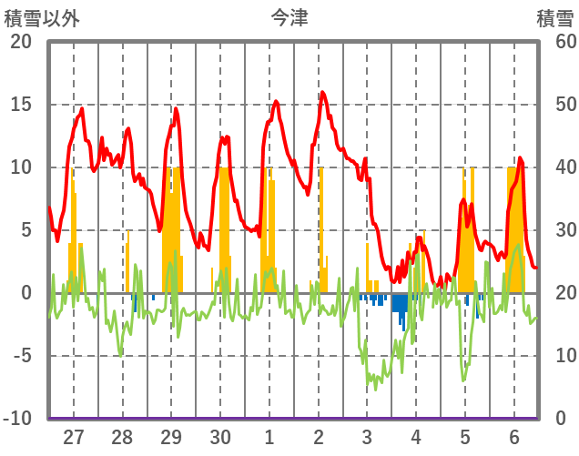 | 日 | 時 | 気温 | 降水 | 風向/風速 | 日照 | 積雪 | 降雪 |