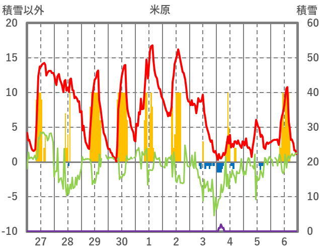 | 日 | 時 | 気温 | 降水 | 風向/風速 | 日照 | 積雪 | 降雪 |