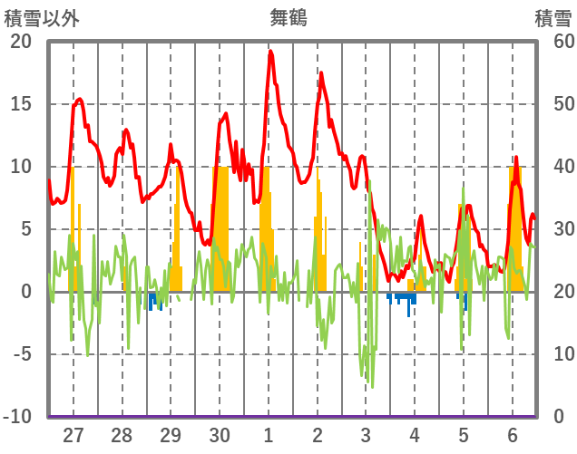 | 日 | 時 | 気温 | 降水 | 風向/風速 | 日照 | 積雪 | 降雪 |